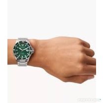 男士手錶配備綠色太陽紋錶盤、銀色棒狀時標和日期窗口、測速儀頂圈、三針機芯和不銹鋼錶鍊。