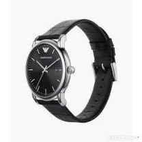 不鏽鋼腕錶配備簡約的黑色太陽紋錶盤、日期窗和鱷魚壓花黑色皮革錶帶。