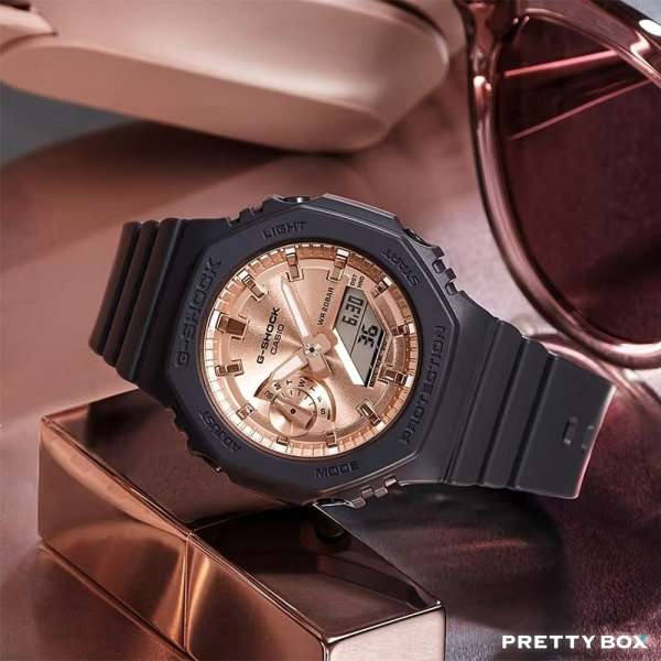 較小巧的 G-SHOCK,粉紅米色上的玫瑰金閃爍耀眼。 玫瑰金離子鍍金屬錶圈,盡顯高貴優雅。搭扣同樣採用玫瑰金離子鍍,與粉紅米色錶帶形成鮮明對比,使金屬閃閃生輝。 閃亮玫瑰金在腕上流露無窮自信和精緻。