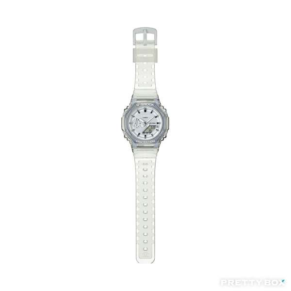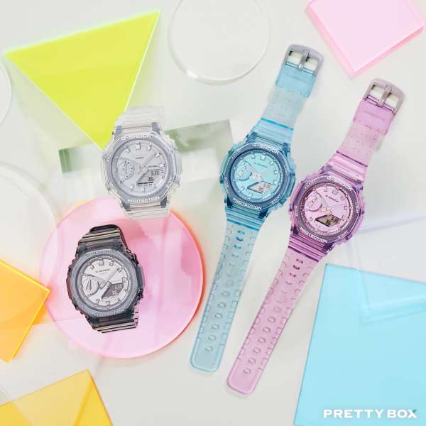廣受歡迎的指針數碼雙重顯示 GA-2100,以更纖薄的外型呈現,增添悅目的金屬質感。腕錶的金屬半透明設計備有多種色彩,全年都可配襯任何造型。時標刻度經氣相沉積飾面處理,活現金屬質感外觀。