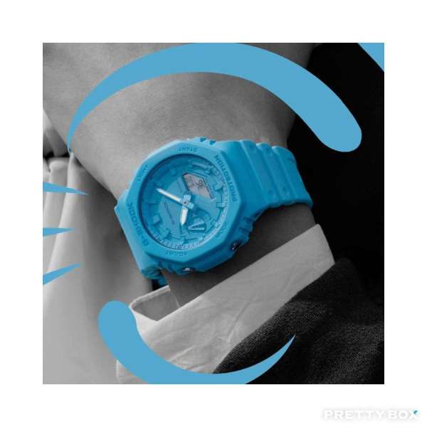 隆重呈獻同色 G-SHOCK — 致力於單色美學、細緻入微的手錶。 GA-2100 採用同色風格打造其標誌性外形,備有三種流行顏色可供選擇:綠松石、白色和螢光黃色。錶殼、錶圈、錶帶,甚至各個錶盤組件均採用深淺稍微不同的同色打造,呈現令人驚嘆的深度和維度的單色造型。 這些色彩繽紛的手錶是街頭時裝的絕佳配飾。