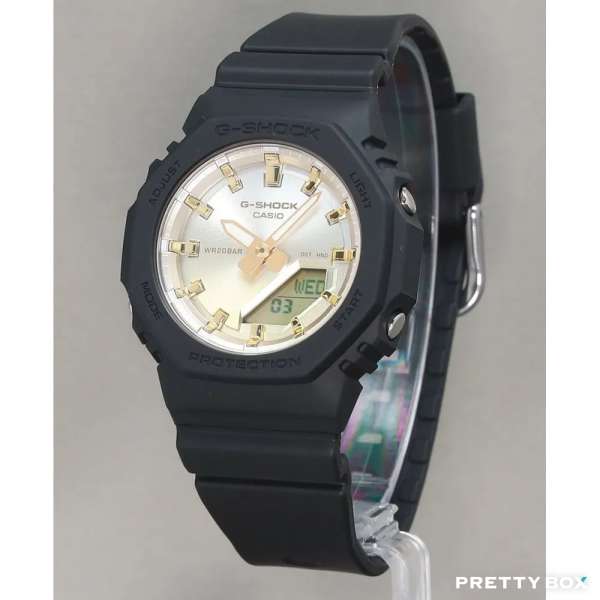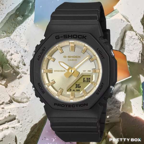 沉醉於手錶的耀眼光芒當中,其靈感源自炫目的夏季日落。 錶盤的新顏色透過氣相沉積技術產生偏光漸變的效果,展現出在美麗的夏日結束時,太陽慢慢降至水平面以下時發出的閃爍光芒。 我們以 GMA-P2100 為基礎,它是流行數碼指針雙重顯示 GMA-S2100 的更小巧版本,並調整錶帶長度,更適合纖細的手腕。我們移除了原來的 9 點位置內嵌錶盤,打造流線型的極簡造型,並採用不銹鋼製造錶扣和側面按鈕,增添一絲奢華感覺。 錶圈和錶帶的重要樹脂組件均採用生物基樹脂製成。使用可再生有機資源生產的物料,可望有助於減少對環境的影響。 全新配色為您的手腕及衣飾帶來奢華的度假風采,而環保物料令沙灘美感躍然眼前。