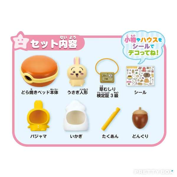 內容: 銅鑼燒床、兔兔公仔、睡衣、魷魚、橡果實、醃蘿蔔、除草認證 3 級、貼紙