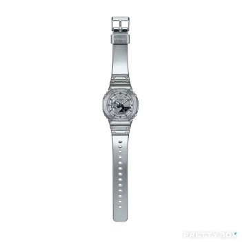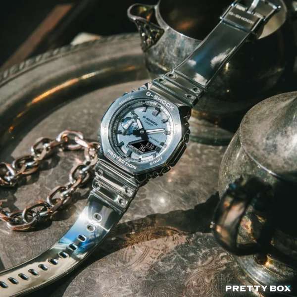 設計大膽的 G-STEEL 與單色銀色配色的精緻光芒相遇。 單色美學將銀色金屬錶圈與新開發的同色堅韌矽膠錶帶搭配得宜。錶帶的表面採用經銀色氣相沉積處理的聚氨酯片保護,使錶帶呈現金屬光澤,觸感極佳。這款手錶佩戴柔軟舒適,具有閃閃發光的金屬外觀,是伴您去任何想去地方的時尚單品。 選擇您最喜歡 — 帶有八角形錶圈的標誌性 GM-2100。