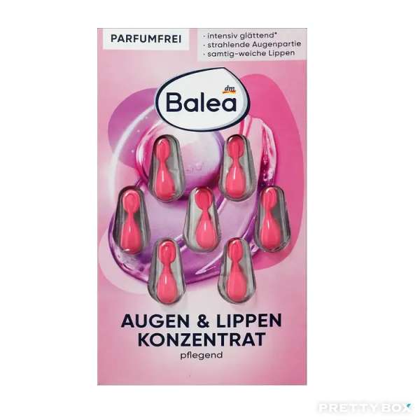 - Balea 眼唇精華膠囊是一款專注於舒緩與修護的特殊護膚產品。蘊含咖啡因的濃縮配方能提供深層保濕,同時活性成分 Kalpariane® 能為疲憊肌膚注入能量。配方中添加月見草油、維生素 E 及角鯊烷,持續使用可幫助眼周肌膚平滑細緻,並促進眉毛與睫毛的健康豐盈。此精華亦可作為雙唇的密集保養,令唇部肌膚回復天鵝絨般的柔軟觸感。