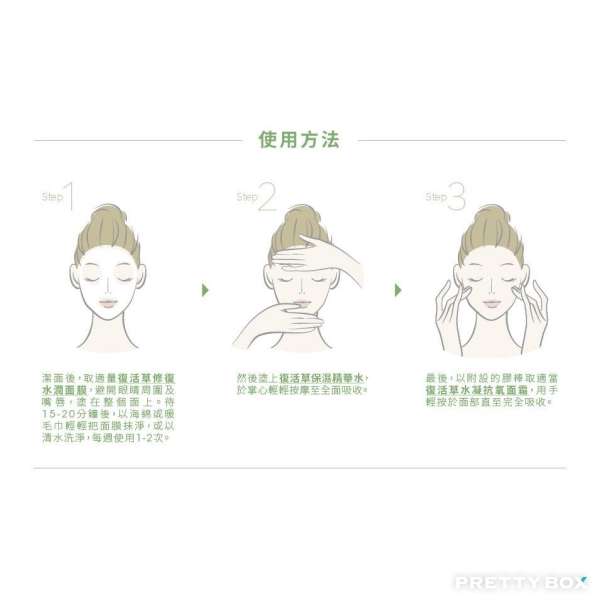 潔面後,取適量復活草修復水潤面膜,避開眼睛周圍及嘴唇,以指尖塗在整個臉上。