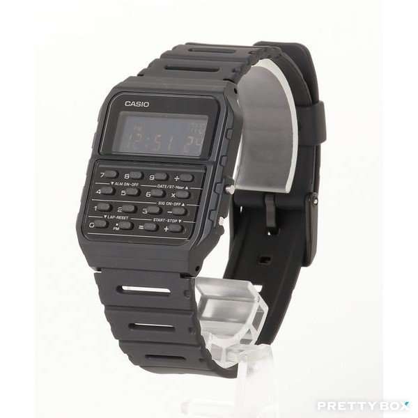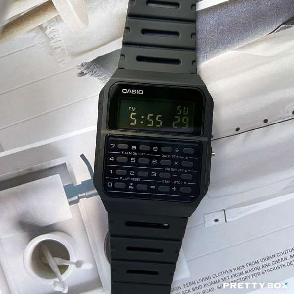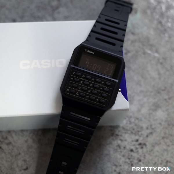 黑色的反轉液晶顯示時間、日期與各種資訊,下方則搭配黑灰色計算機按鈕設計