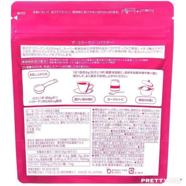 資生堂骨膠原蛋白粉以低分子魚骨膠原為主的專利美容飲品,同時配合能輔助美顏的杜仲葉、高麗胡蘿蔔、蓮胚芽、amura果實萃取物、透明質酸、輔酶Q10、維他命 B2、維他命 B6、維他命 C、維他命 E 等成分,讓您年輕,紅潤每一天。